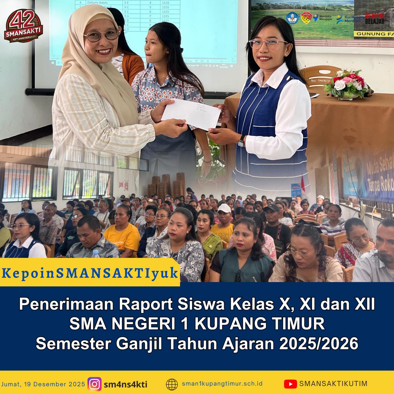 Kupang Timur, 19 Desember 2025 – SMAN 1 Kupang Timur secara resmi melaksanakan kegiatan penyerahan Laporan Hasil Belajar (Raport) Semester Ganjil Tahun Pelajaran 2025/2026 pada Jumat, 19 Desember 2025. Kegiatan ini menjadi momentum krusial bagi sekolah, orang tua, dan siswa dalam mengevaluasi capaian akademik selama satu semester terakhir.